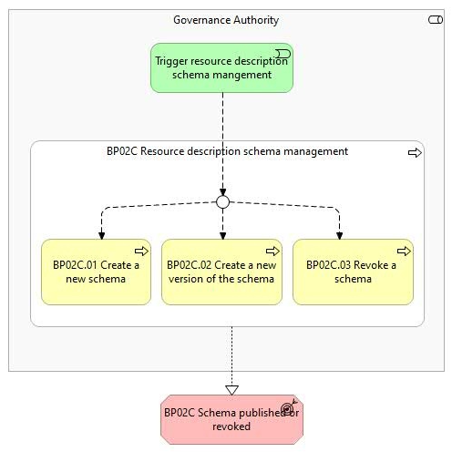 - Schema published or revoked: The new schema, the new version of an existing schema, or the revocation of an existing schema is an outcome of resource description schema management. This makes the schema available for Providers for creating or updating resource descriptions, or unavailable in the case of revocation. (Business Process 5B).